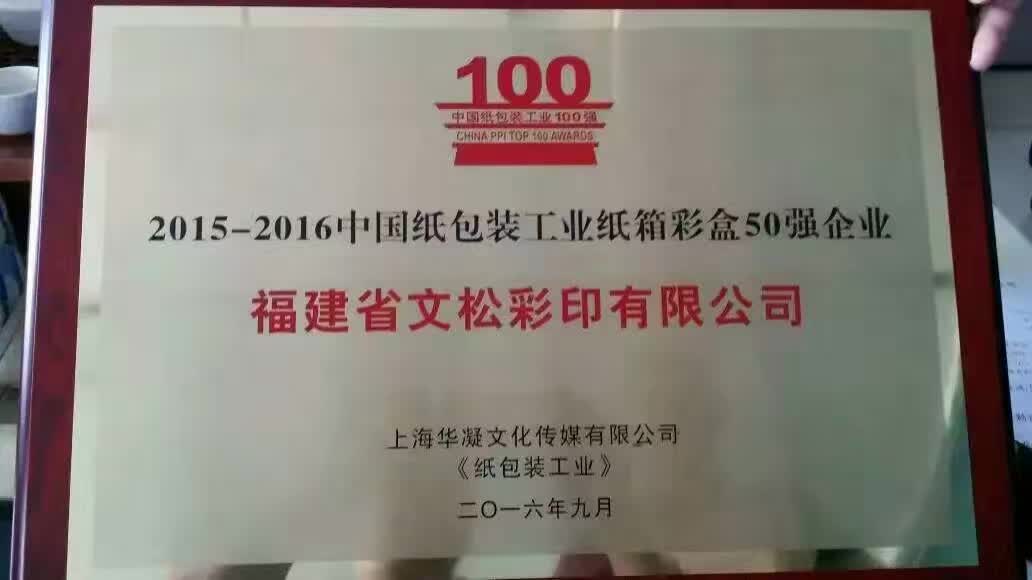 福建省文化松彩印有限公司于2016年9月榮獲由上海華凝文化傳播有限公司《紙包裝工業(yè)》評選的2015-2016中國紙包裝工業(yè)紙箱彩盒50強(qiáng)企業(yè)榮譽稱號。